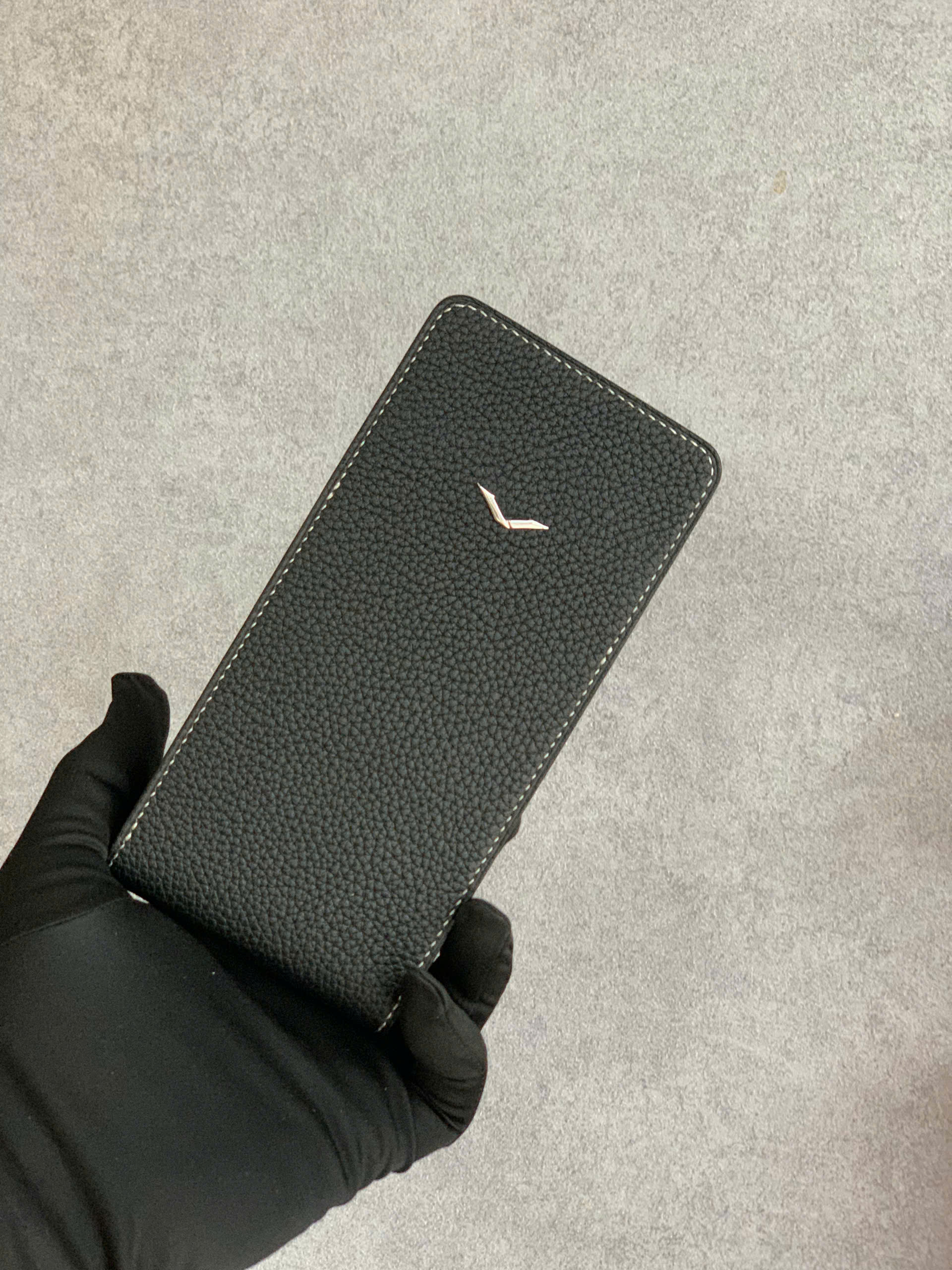 Chiếc bao da trở nên nổi bật hơn với logo Vertu được làm từ thép không gỉ, sắc nét và bền màu theo thời gian. Đây không chỉ là một chi tiết trang trí mà còn là lời tuyên bố ngầm về gu thẩm mỹ và đẳng cấp cá nhân.