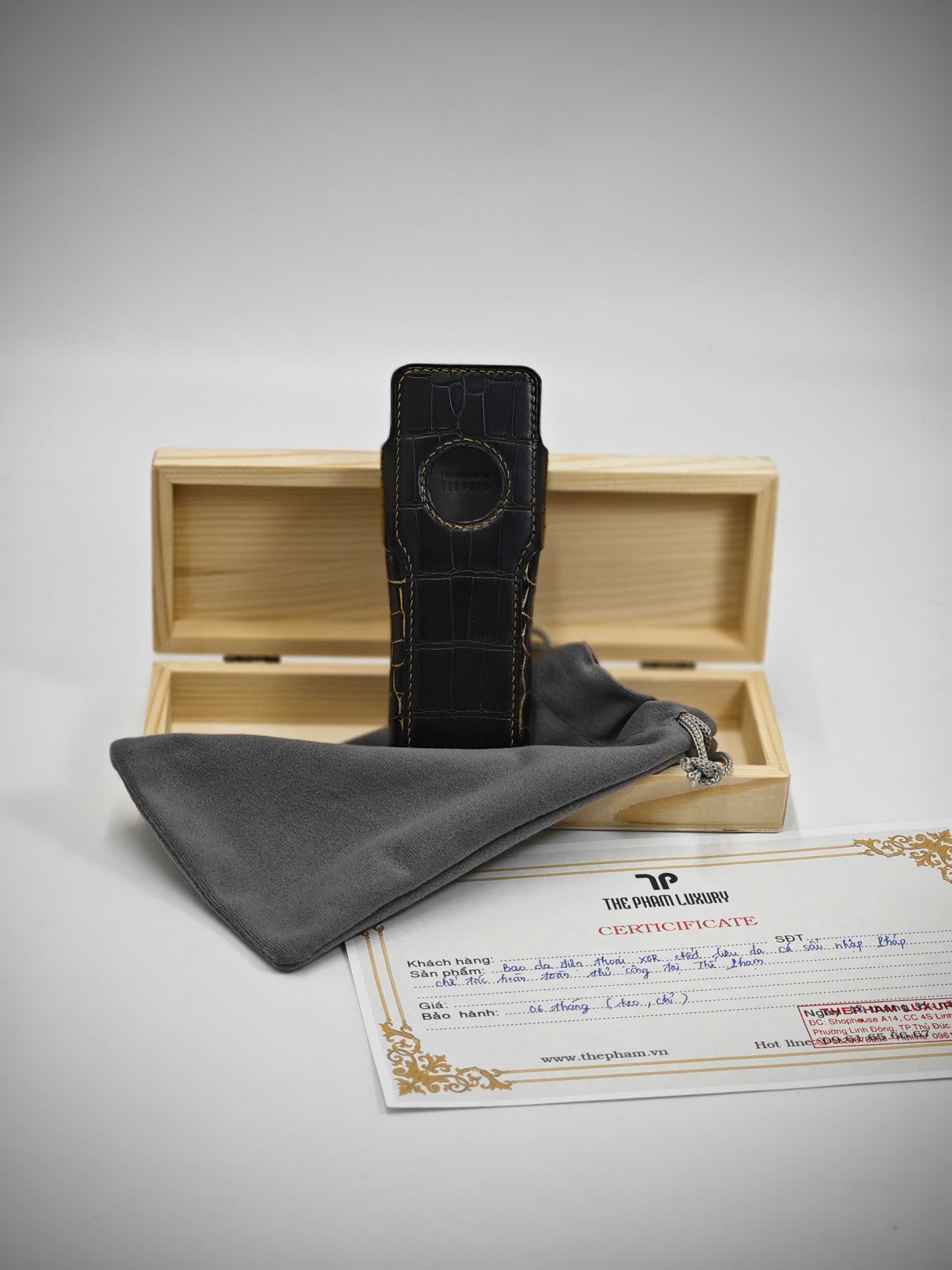 Một chiếc điện thoại đẳng cấp xứng đáng với một chiếc bao da xứng tầm. Bao da XOR da cá sấu Pháp phối nhũ vàng của Thế Phạm không chỉ là phụ kiện, mà còn là minh chứng cho gu thẩm mỹ tinh tế, khẳng định đẳng cấp và phong cách riêng của chủ nhân.