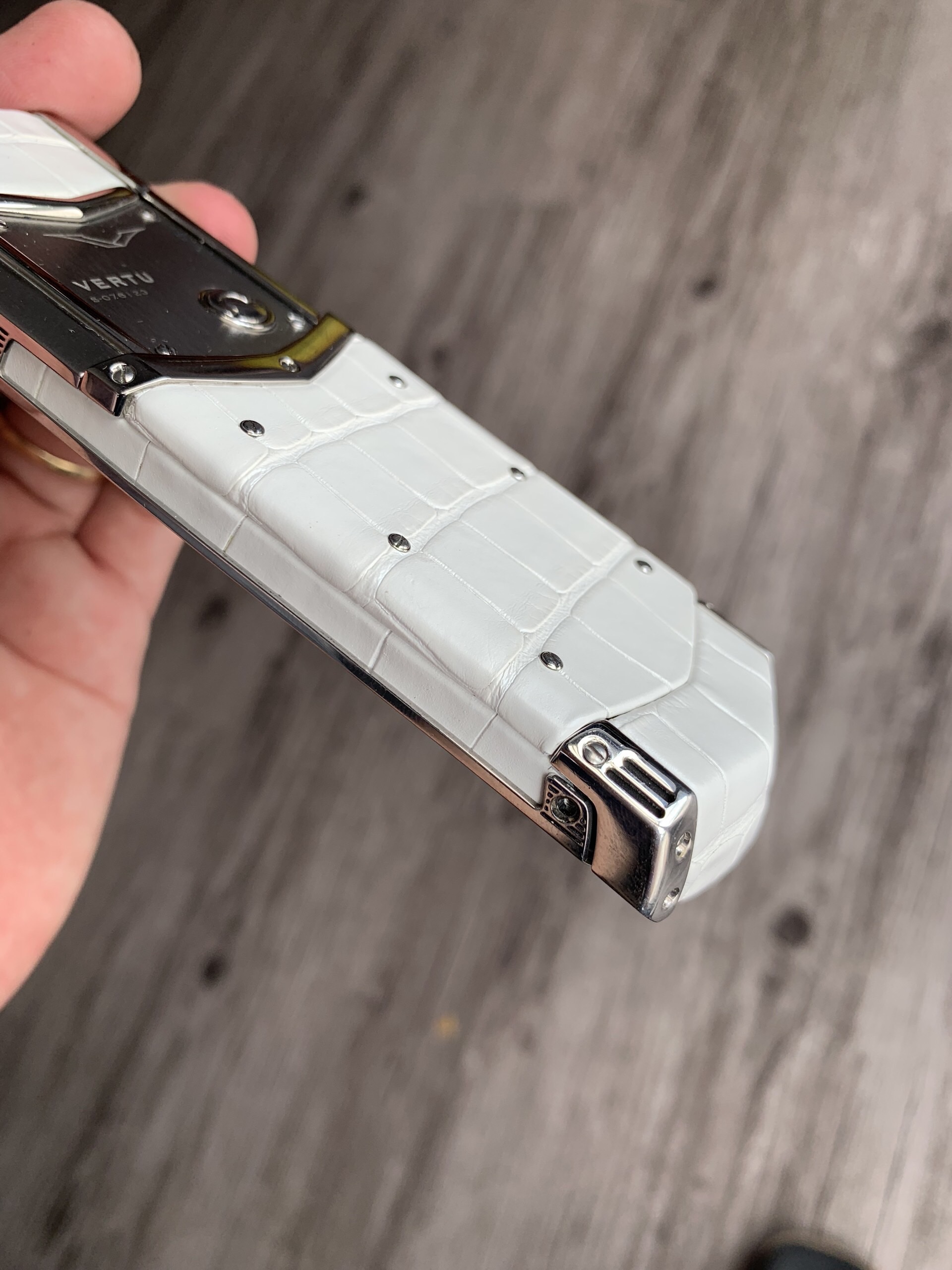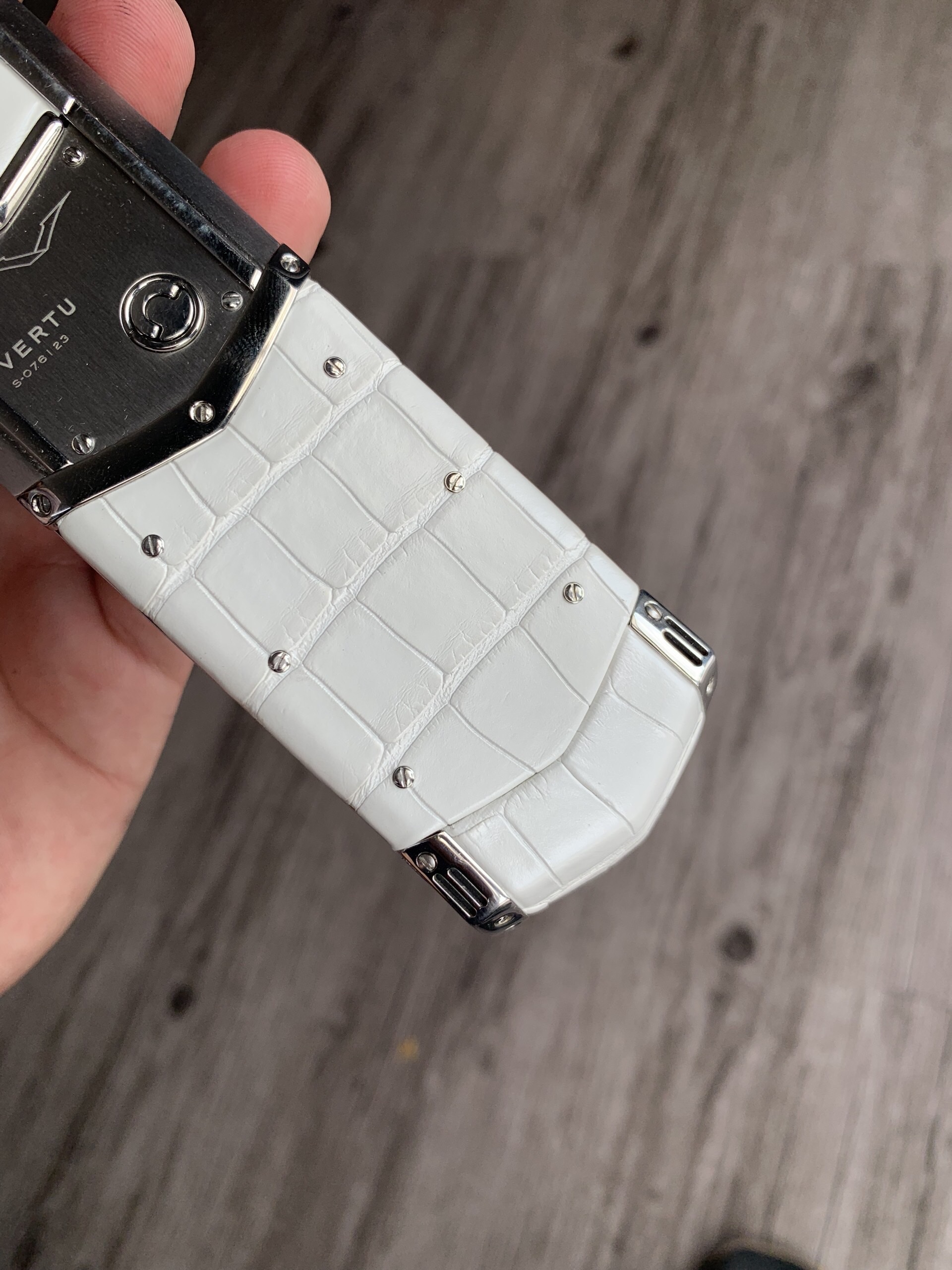 ✨ Bọc da điện thoại Vertu Signature S cá sấu Pháp – Màu trắng ngọc trai, vân bụng là lựa chọn hoàn hảo dành cho những ai muốn khẳng định đẳng cấp và cá tính.