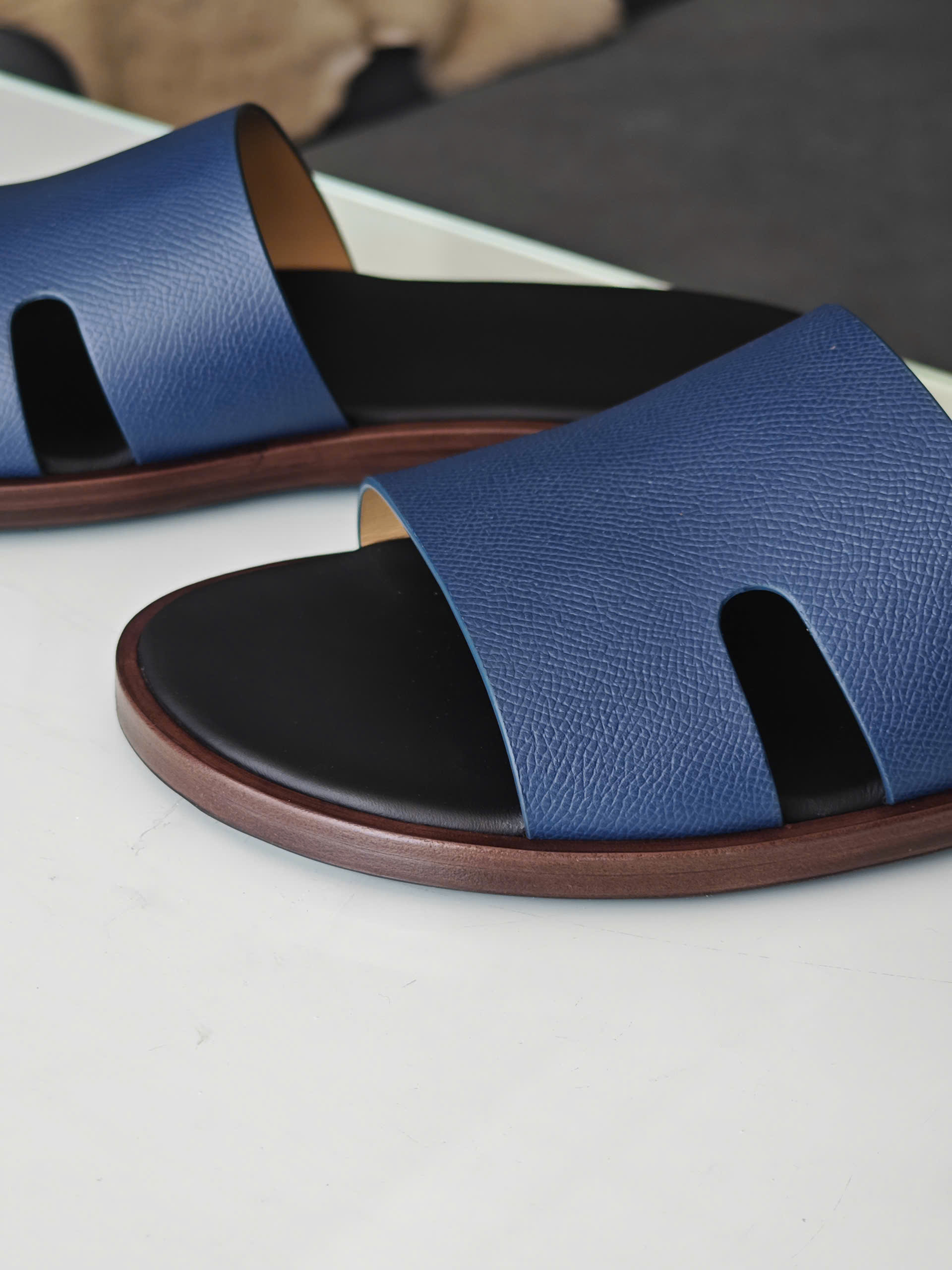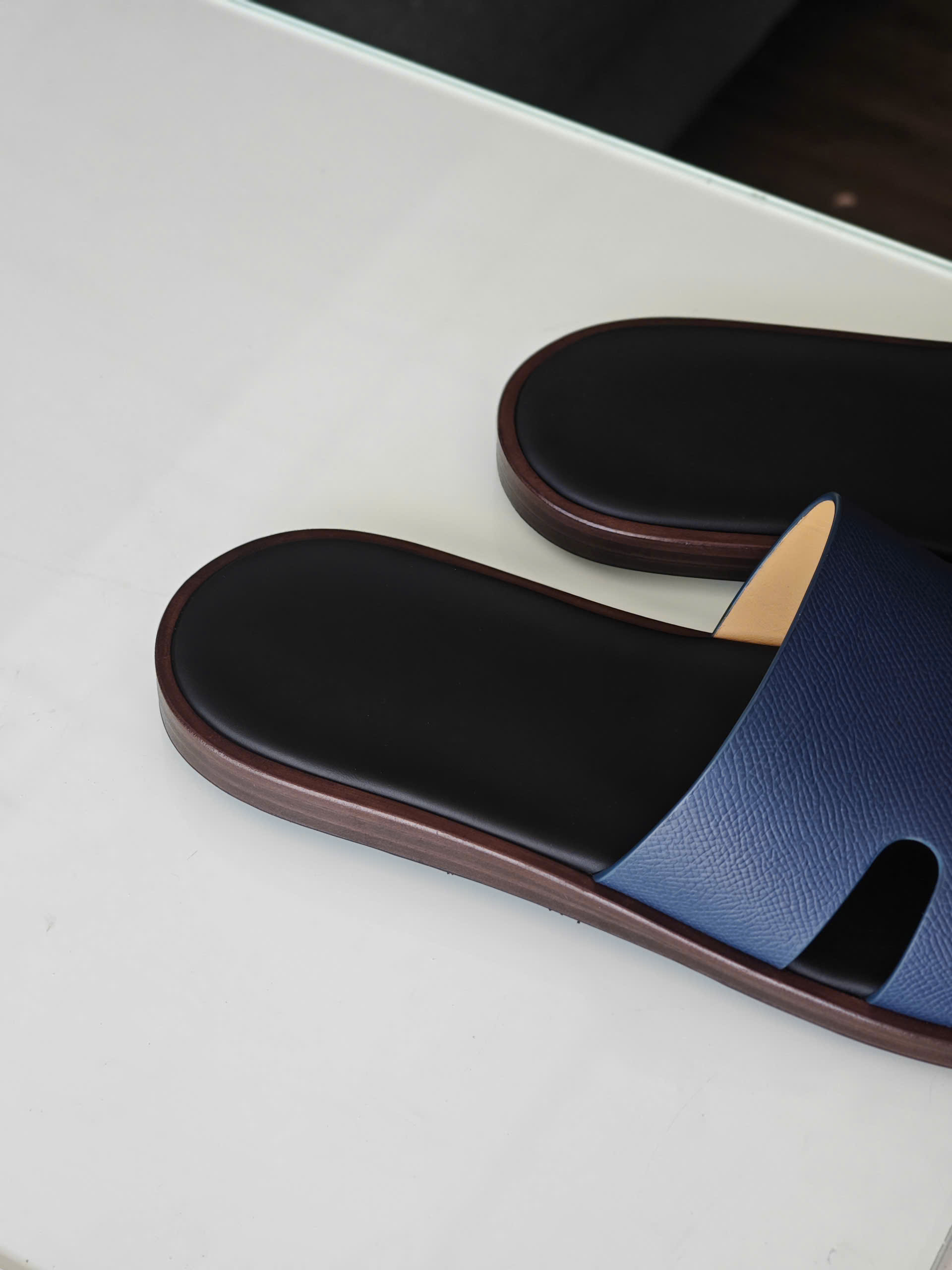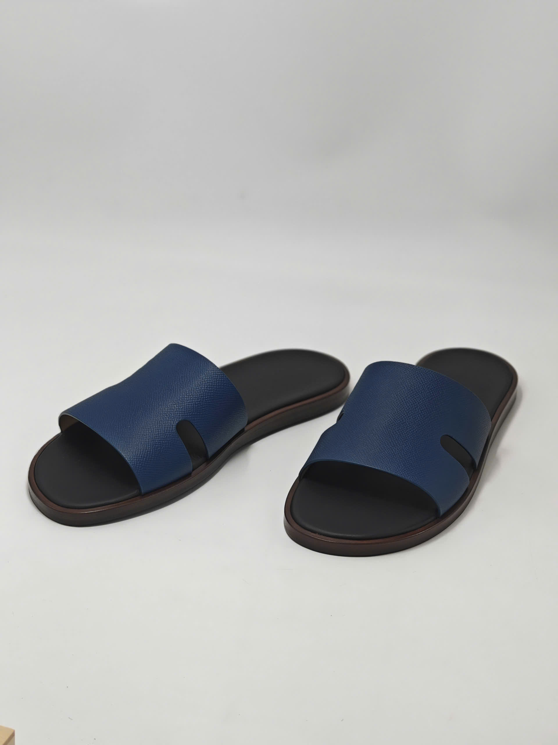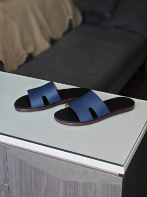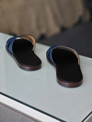 Đôi dép da thủ công TP màu navy lót đen là một thiết kế dành cho những quý ông yêu thích sự tinh giản và sang trọng.