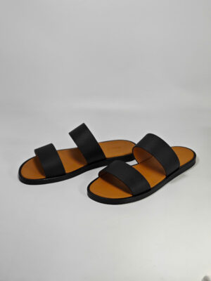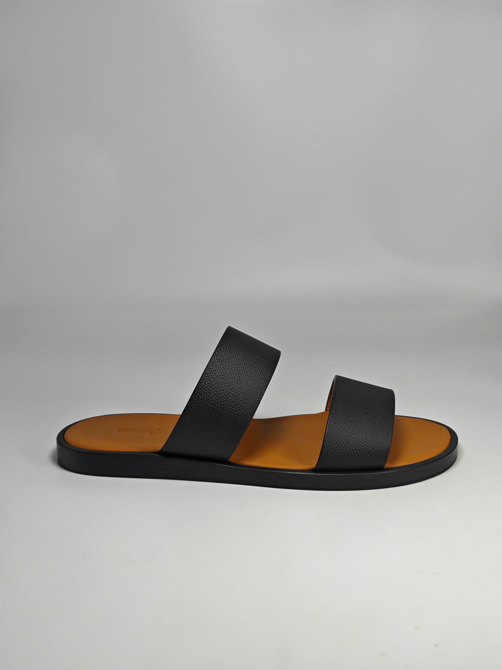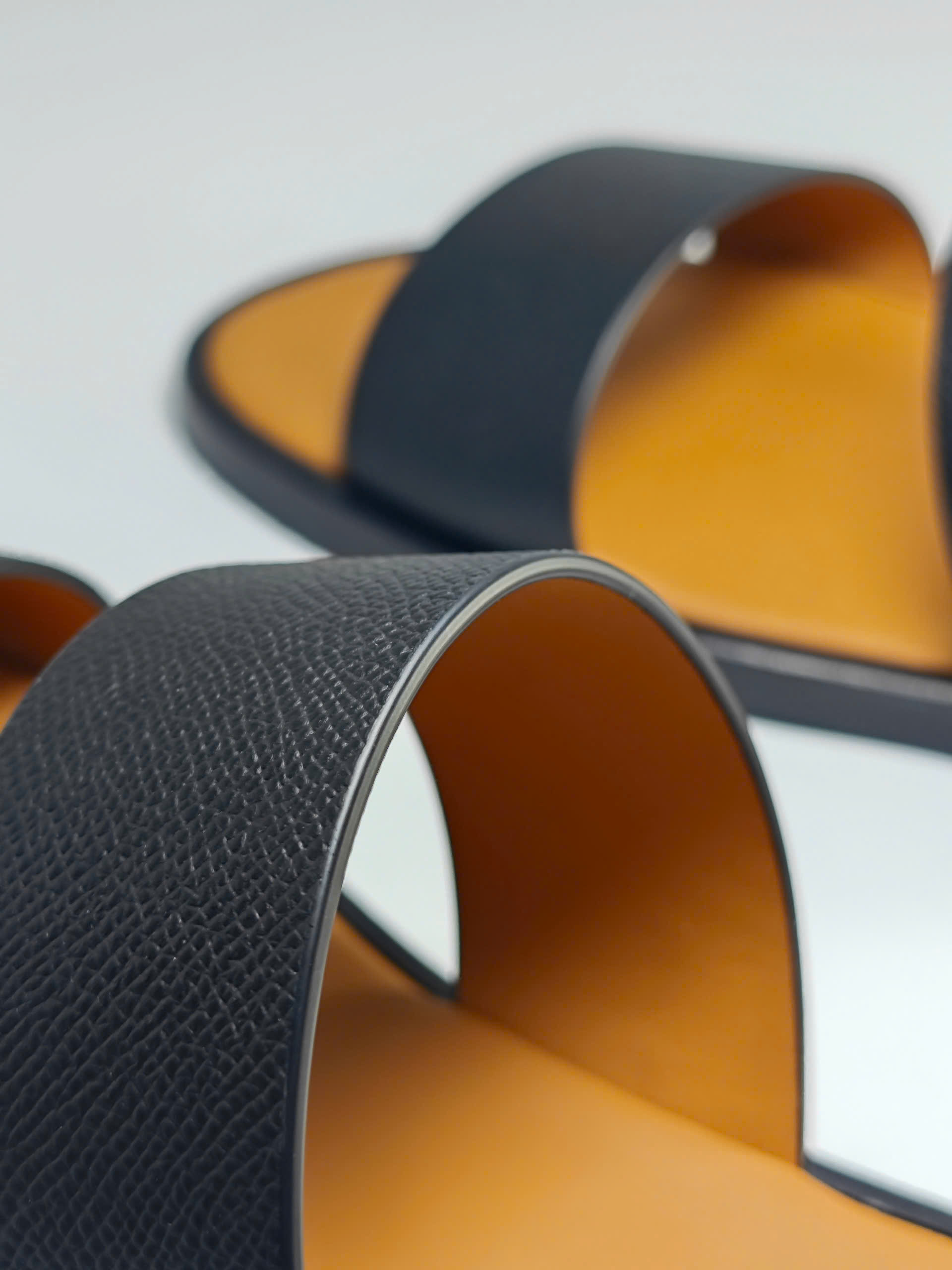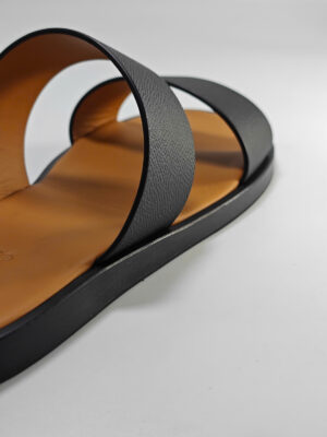 Toàn bộ phần quai Dép TP nam – GoRi màu đen lót vàng bò được làm từ da Epsom Weinheimer nhập khẩu từ Đức – dòng da nổi tiếng với độ bền, khả năng chống trầy xước và giữ form tốt theo thời gian. Lớp da được xử lý kỹ lưỡng, bề mặt vân mịn tự nhiên, vừa mềm mại khi chạm vào nhưng vẫn giữ được cấu trúc đứng form khi sử dụng lâu dài.