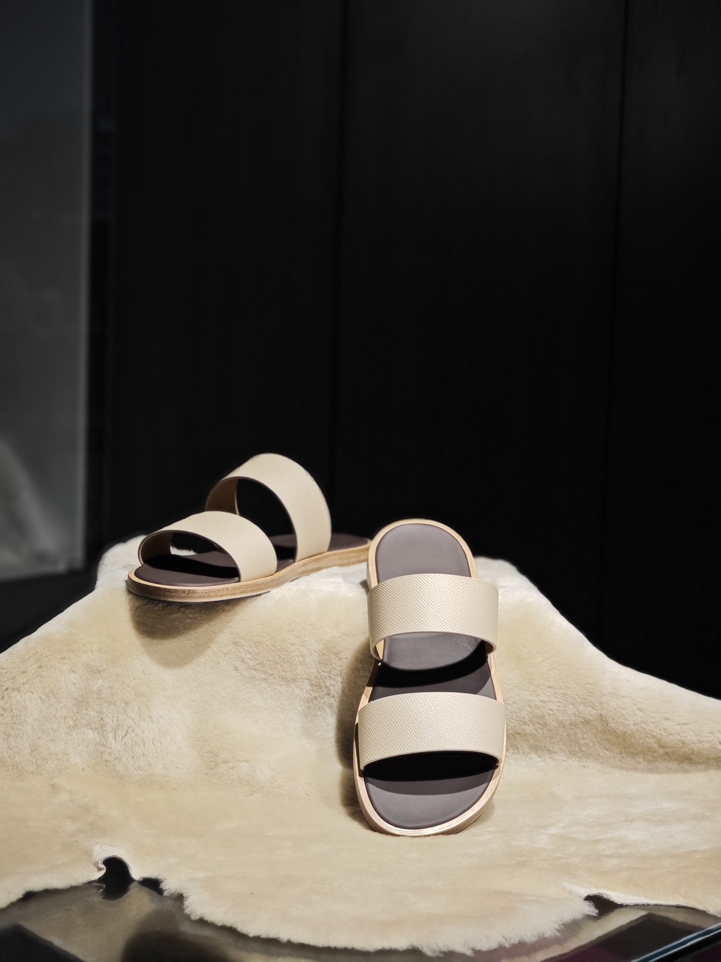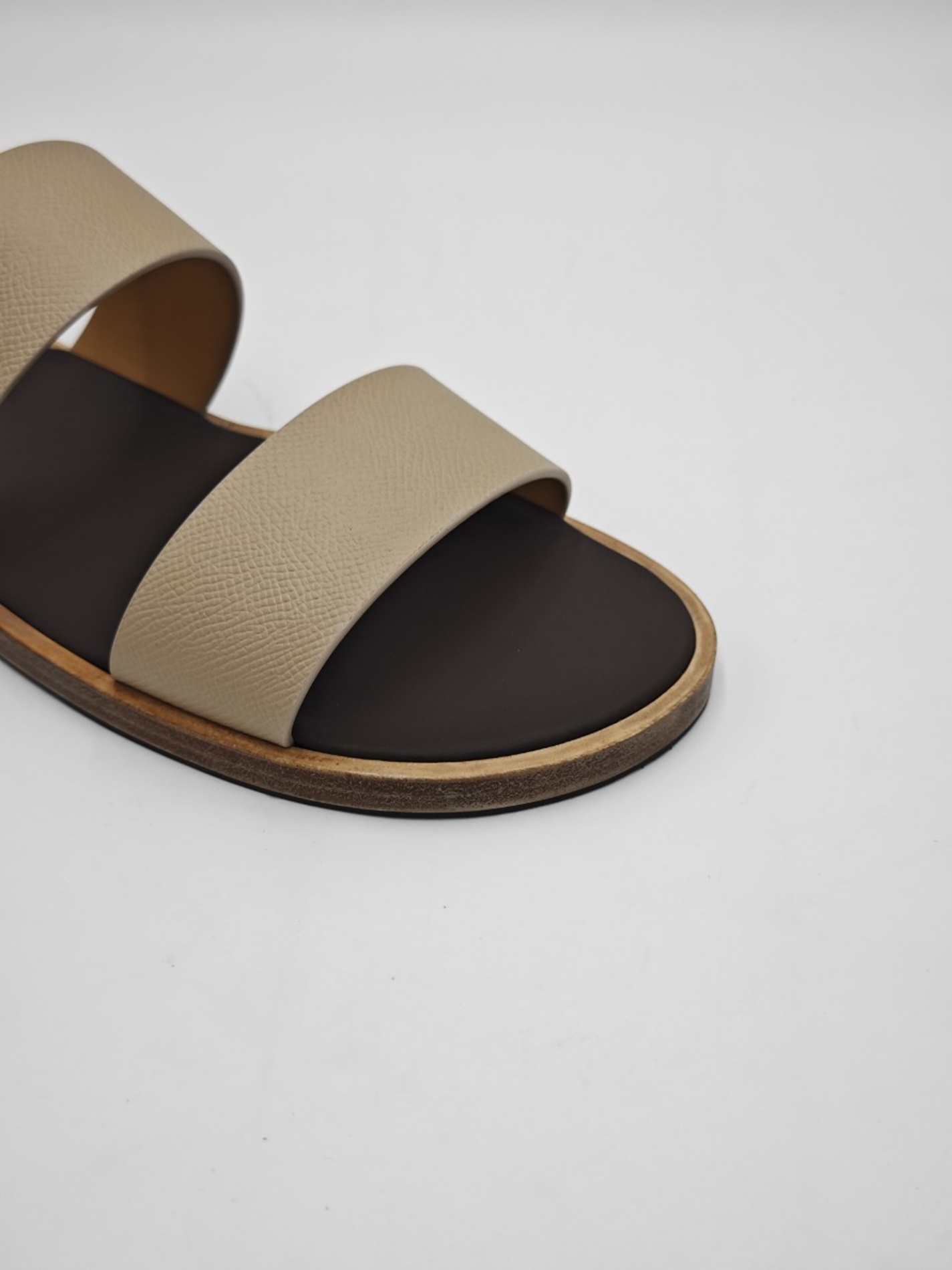 Quai dép sử dụng da Epsom nhập từ nhà máy Weinheimer (Đức) – một trong những loại da thuộc thảo mộc bền bỉ, chống trầy tốt và giữ form tuyệt vời qua thời gian. Vân da nhẹ, đều, bề mặt nhám lì giúp hạn chế vết xước và dễ vệ sinh.