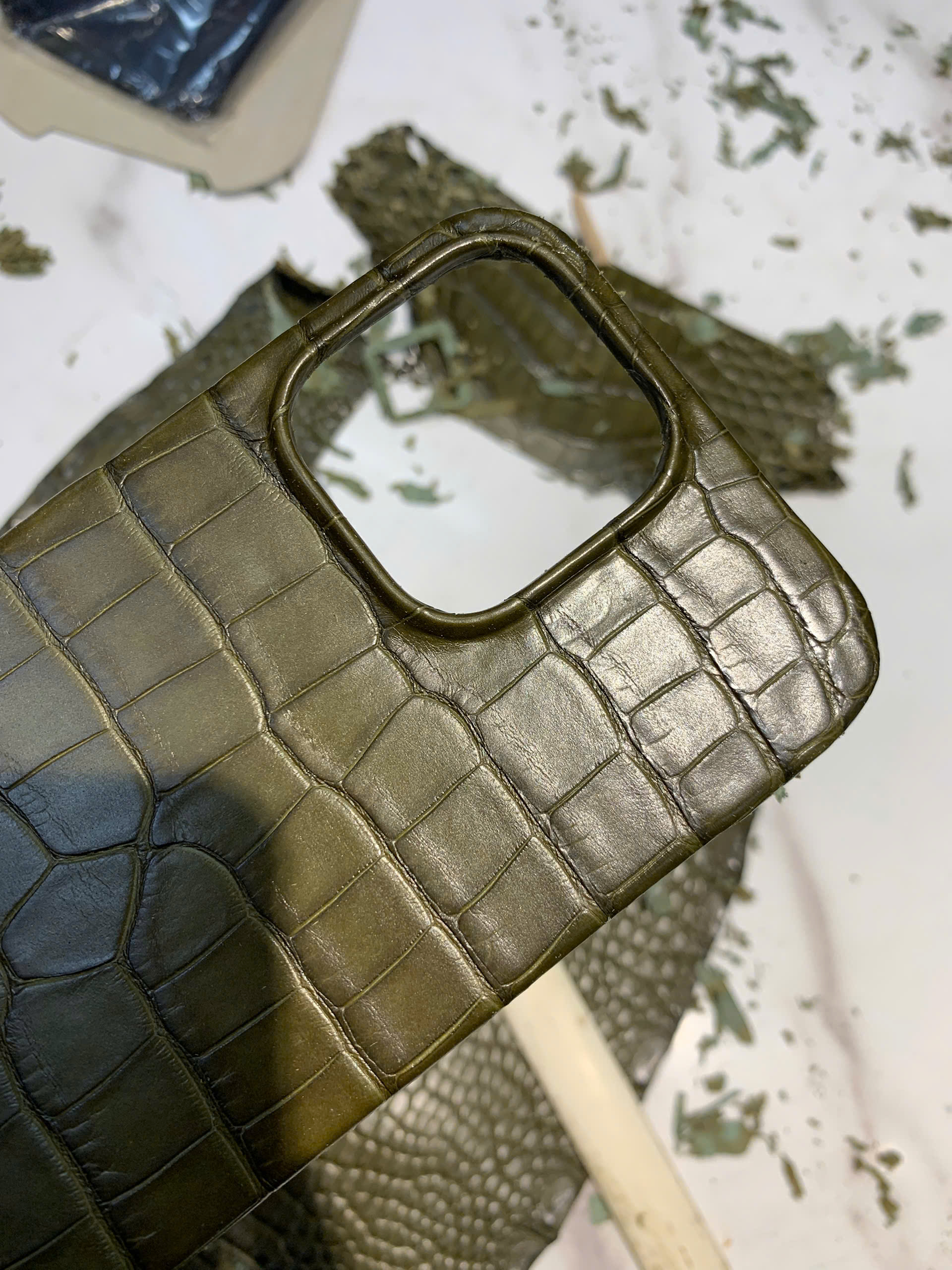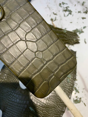 Khi kết hợp với bề mặt da cá sấu vân bụng, màu xanh olive không chỉ là màu sắc, mà còn là một lớp “filter” tự nhiên giúp làm nổi bật cấu trúc vân da. Ánh sáng phản chiếu trên từng ô vân tạo nên hiệu ứng thị giác nhẹ nhàng nhưng có chiều sâu – điều mà các vật liệu công nghiệp khó có thể tái tạo.