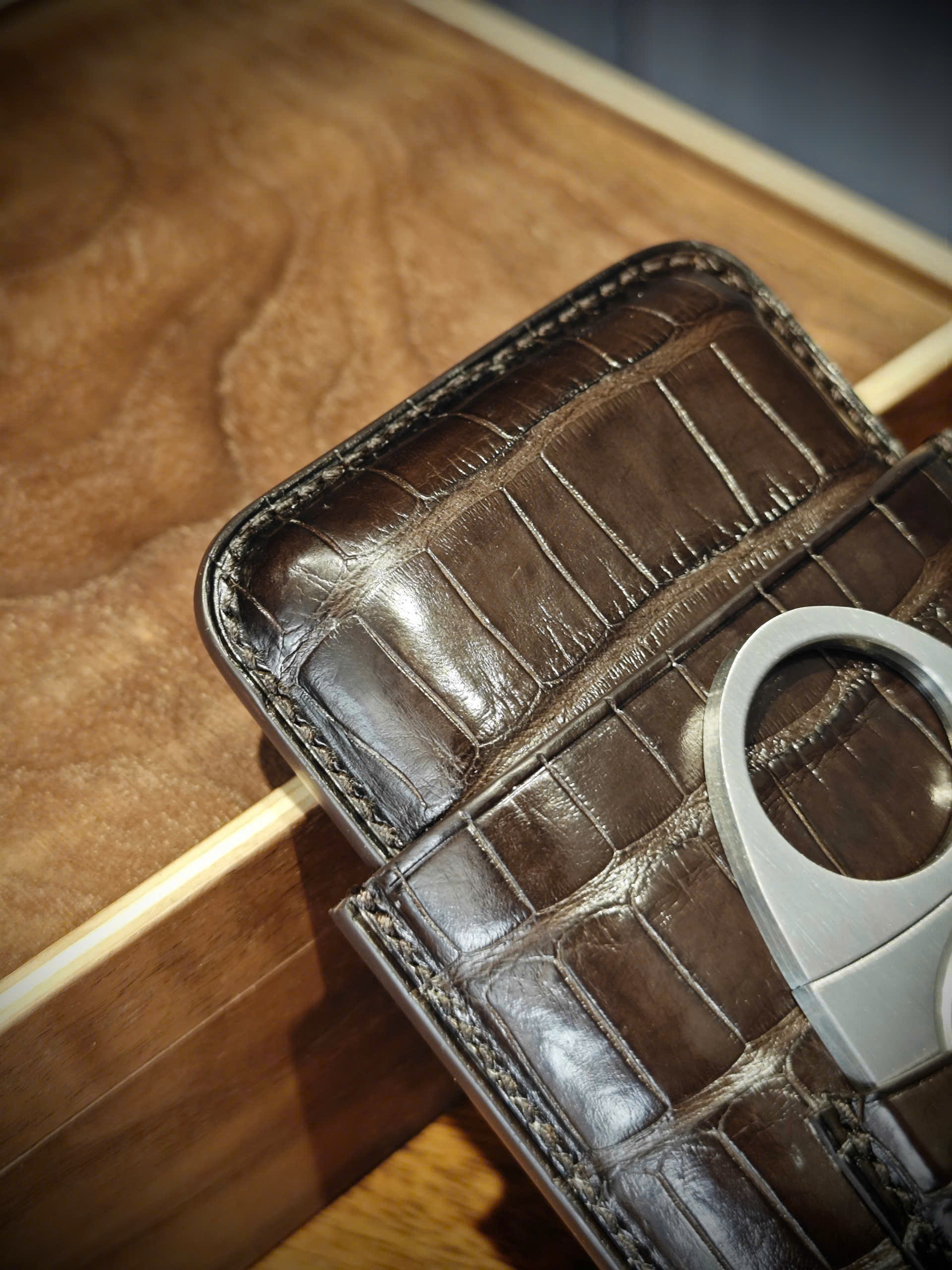 Phiên bản vân đuôi đòi hỏi kỹ thuật chế tác cao hơn do bề mặt da có độ gồ tự nhiên. Để giữ được form chuẩn cho bao da xì gà 3 điếu, từng mũi khâu phải chính xác và cân đối, không làm lệch nhịp vảy.